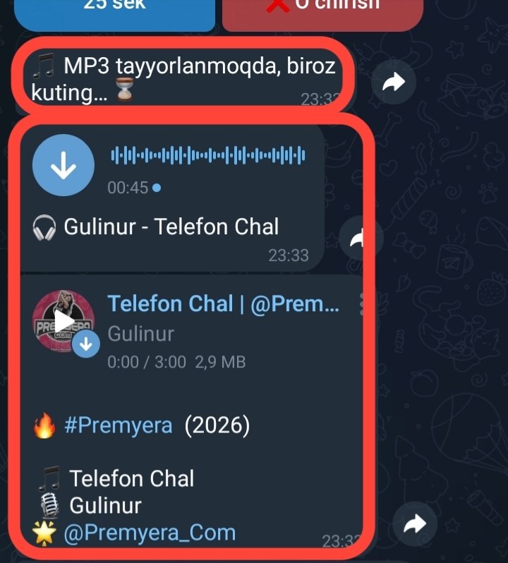 shu bilan uzog'i bilan 30 sekun ichida sizga mp3 tayyor holatga keltiriladi va har bir tahrirlangan mp3 uchun sizdan 200 so'm undiriladi botga birinchi tashrif buyuruvchilar uchun bonus sifatida 400 so'm balansiga qo'shib beriladi qolgani o'zingizni hohishingiz agar siz vip tariflardan sotib olsangiz hisobingizdan -200 ayrilmaydi faqat vip muddatigacha amal qiladi!